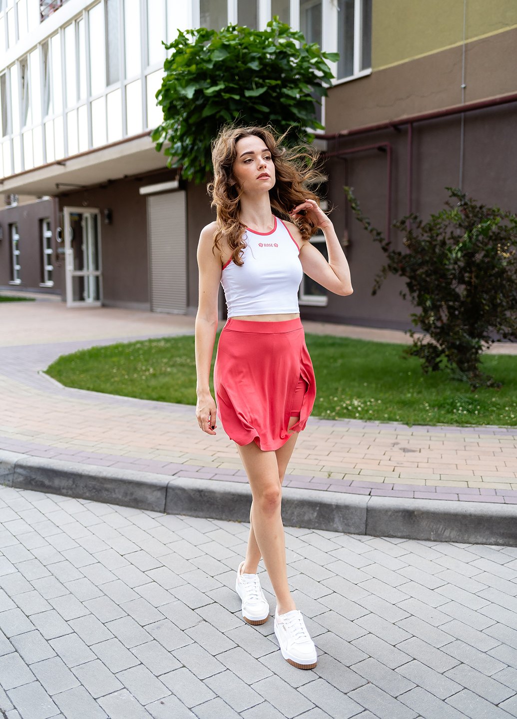 • Топ:  укорочений кроп-топ з контрастною окантовкою та написом. Щільно прилягає до тіла, підкреслюючи фігуру.