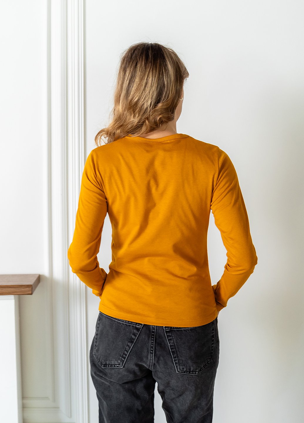 Лонгслів виготовлений із стрейч-куліру, він м’яко облягає тіло, підкреслюючи силует і дозволяючи вільно рухатись завдяки натуральному складу тканини: 95% бавовни та 5% еластану.