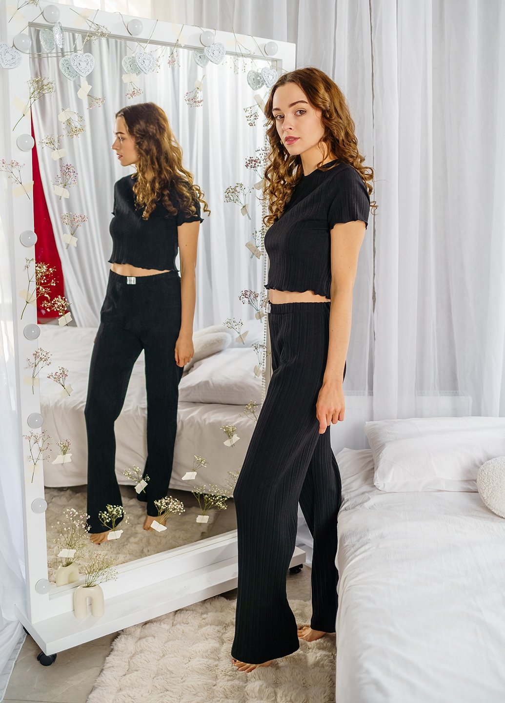 Цей стильний комплект виготовлений з м’якого трикотажу, що складається з 95% бавовни та 5% еластану. Завдяки такій комбінації матеріалу приємний до тіла, добре пропускає повітря та забезпечує максимальний комфорт під час носіння. Комплект складається з укороченої футболки з хвилястим краєм та штанів з еластичним поясом, що м’яко облягають фігуру, не обмежуючи рухів.